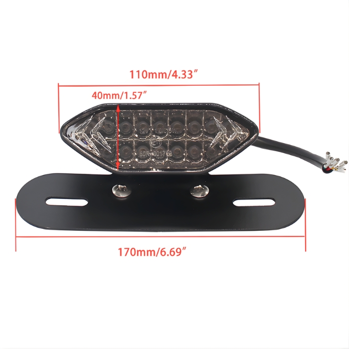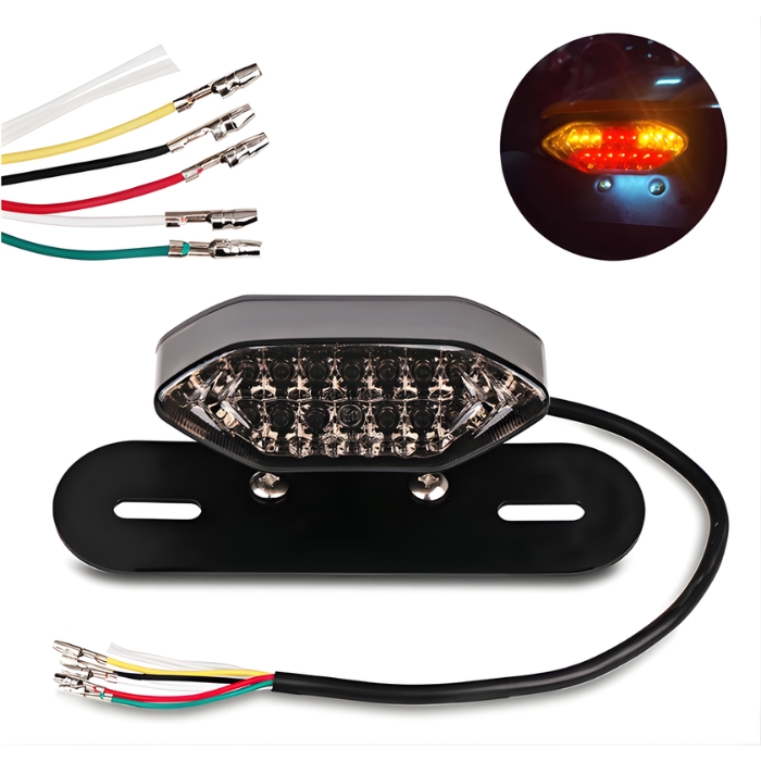 Мултифункционален LED стоп за мотоциклет, съчетаващ в едно компактно тяло стоп светлина, мигачи и осветление за регистрационен номер. Практично и модерно решение, което подобрява видимостта, безопасността и визията на вашия мотор.