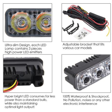 Комплекта съдържа 2 броя дневни светлини с мощни 3 бр. диоди с ниска консумация.
