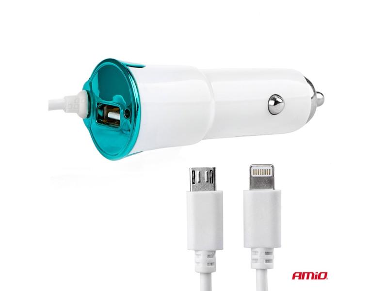 Зарядно за кола, 2 кабела, Iphone 5, microUsb, USB, 12/24V 01264 Amio.