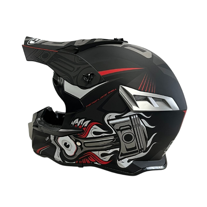 Кросова каска с висока защита, предназначена за мотокрос и офроуд активности. Изработена от здрави композитни материали за максимална безопасност при удари. Вентилационната система осигурява оптимален комфорт и охлаждане, дори при интензивно използване.